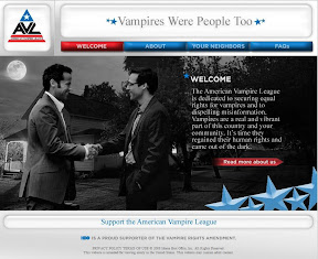 The Fellowship of the Sun site includes information for two more True Blood-related sites: Lovebitten and the American Vampire League. Lovebitten purports to be "the best human/vampire dating site" where you can "find eternal love." The site is more well-designed than the fellowship's web site, which goes along with the HBO campaign's general pro-vampire vibe. Likewise, the American Vampire League's web site is also well-designed, bearing some similarities to the polished web sites of politicians and political parties.