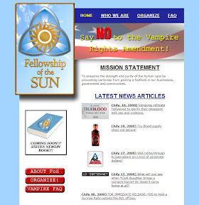 New York magazine's July 28-August 4 issue contains an ad for "Fellowship of the Sun," bearing the slogan, "Vampires are immoral." It directs you to a web site for the group, whose mission is "To preserve the strength and purity of the human race by preventing vampires from gaining a foothold in our businesses, government and communities." Like the other campaigns, though, the print ad is far superior to the web site itself. While the print ad is striking and certainly makes an impact (especially with its placement at the front of the magazine, before all the content), the web site is poorly designed and cheesy. The appearance of the site is most likely intentional, since the campaign seems all about vampires' rights, the contrast between the fellowship's print ads and web site is noticeable and jarring.